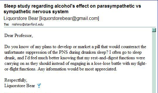 Alcoholics everywhere intuitively know this, but now it’s been confirmed in a Japanese study.* Passed-out sleep is different from regular sleep. Without alcohol in your system, sleep provides rest and recovery for your body; your parasympathetic nervous system takes over from your sympathetic nervous system, lowering your heart rate and initiating muscle relaxation. But if you’re gooned, your sympathetic nervous system—ordinarily dominant when you’re aware and alert—doesn’t let go. You may be technically unconscious, but your nervous system thinks you’re still awake, so those demanding functions never go offline and take a rest.