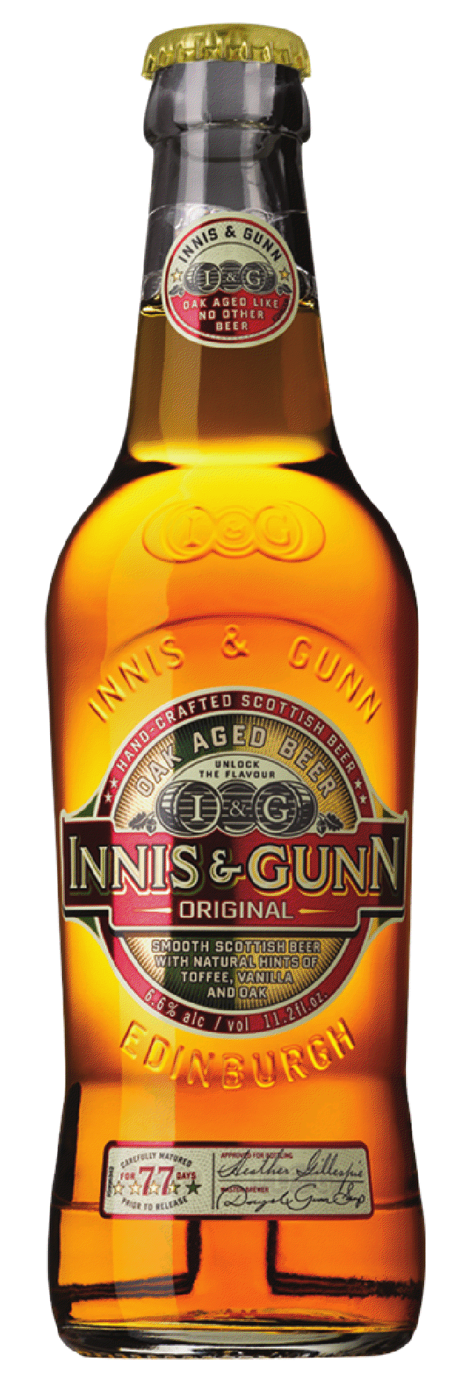 Brownish amber with a finger (for those of you who have them) of off-white foam and some feisty carbonation, INNIS & GUNN OAK AGED BEER sidles up to your olfactory centre like it’s known you all its life. Psssst, it urges—caramel…toffee…early-morning bakery…oak…Scotch malt—and blammo! It has you by the short fur, caressing your senses with its whisky redolence. This beer has stunning complexity. The notes aren’t unplaceable; instead they conjure up scented memories of highlands, lowlands, peat and damp. INNIS & GUNN has you at smell, but wait until you sip, because that’s when it really grabs you under the kilt.