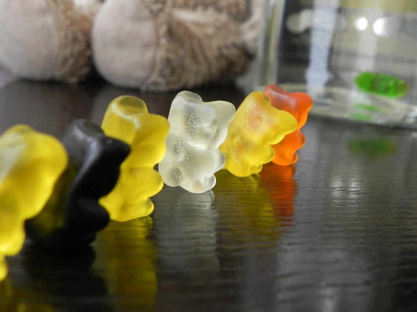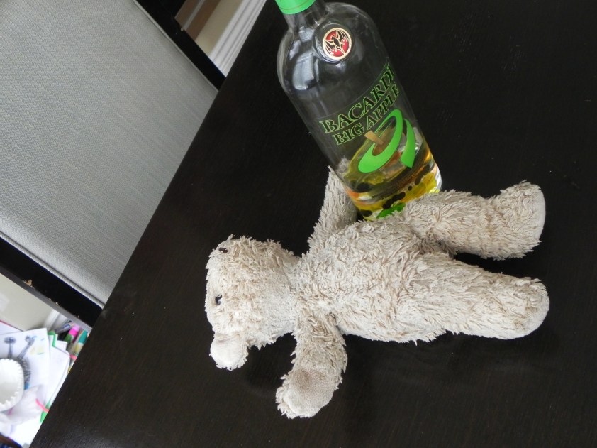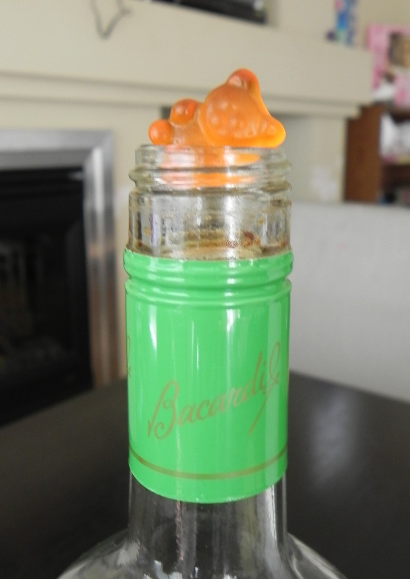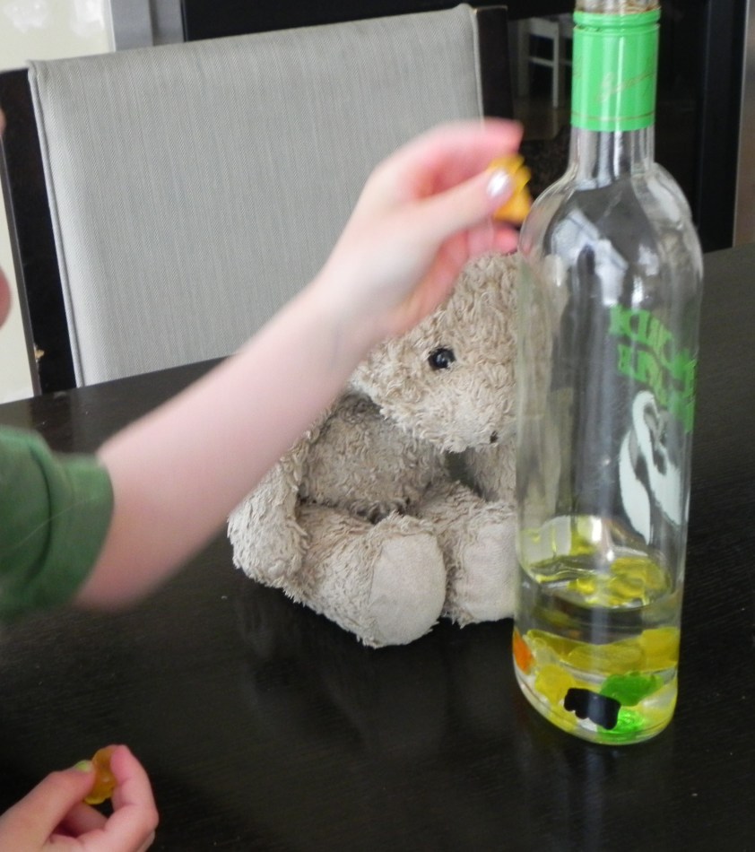As it happened, four-year-old Miss V had a whole bunch of gummy bears, and there was a mostly empty bottle of Bacardi Big Apple languishing in the liquor cabinet. Perfect preschool activity, wouldn’t you say?