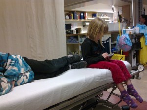P’s fever jacks up as she dozes on and off. V, who has wanted to leave for three hours, becomes more insistent. Although the waiting room is thinning out, which allows P a full couch to spread out on, it’s obviously prime time for after-school injuries: one teenage boy after another reports with jutting bones, teeth out, bad sidewalk impacts. All these leapfrog V in priority.