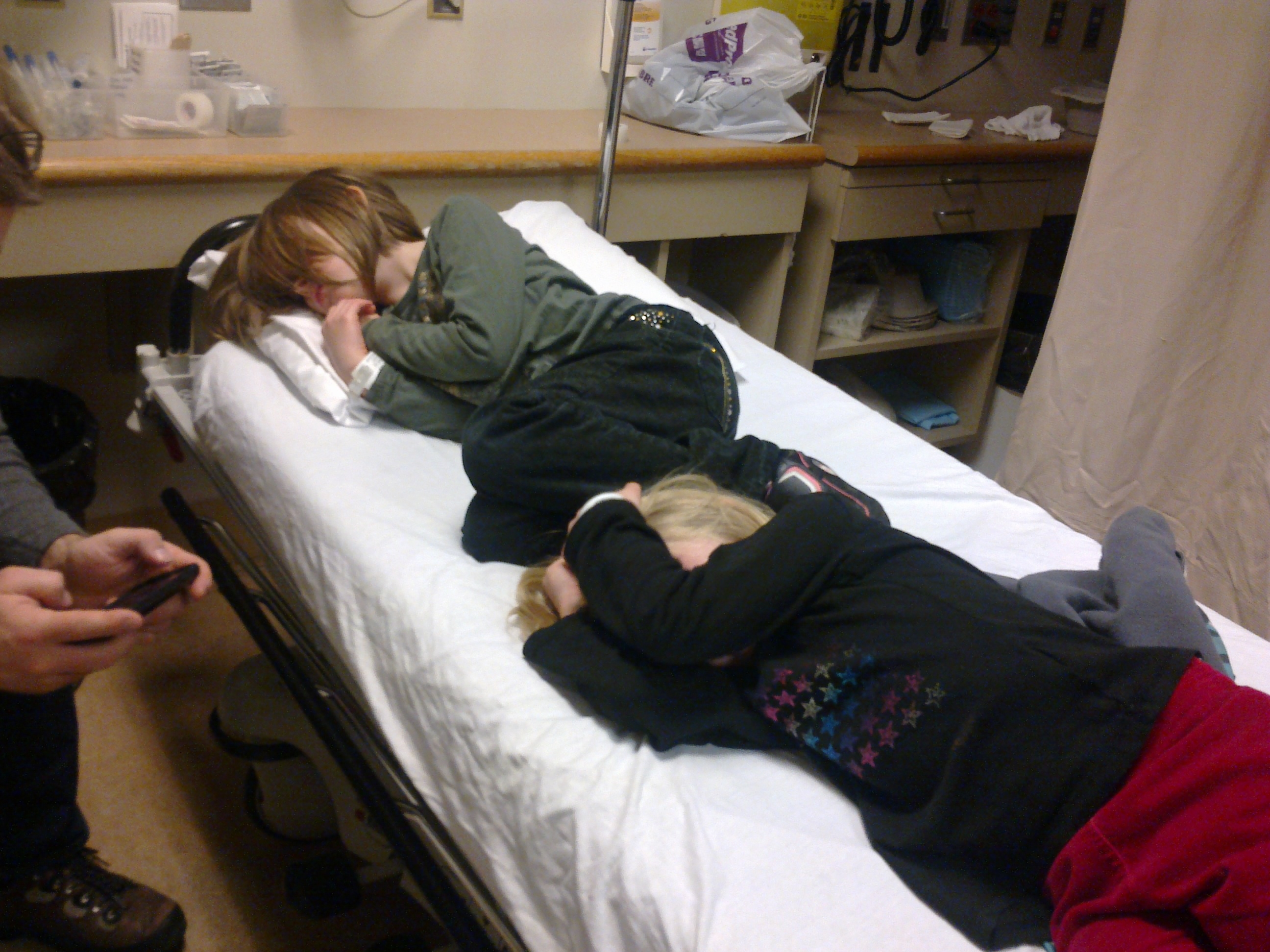 My dad arrives with half a box of Timbits. Fellow waiting-room denizens are by this time commenting on the girls’ patience and good behavior—they can’t believe there hasn’t been a meltdown yet. The girls are too tired.