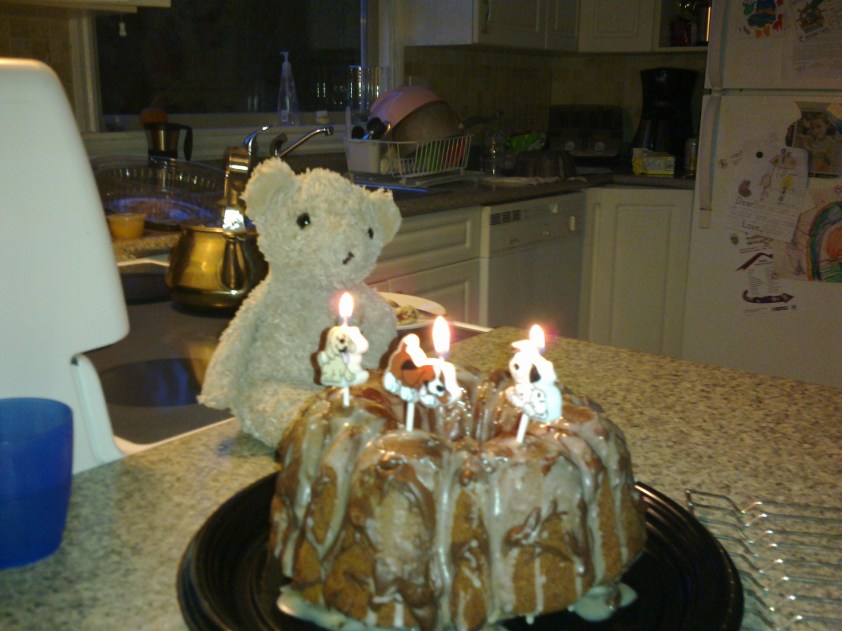 Well, not just mine. I had two co-celebrants: a poodle and a chihuahua. Note (if you can make it out) the doggie candles. It seems we had no bear candles.